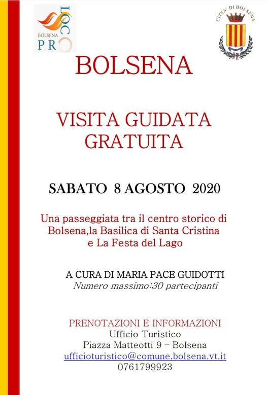News ed Eventi Bolsena: visita guidata gratuita – 8 Agosto 2020 Pubblicato il Maggio 4, 2021Novembre 10, 2023 da admin 04 Mag