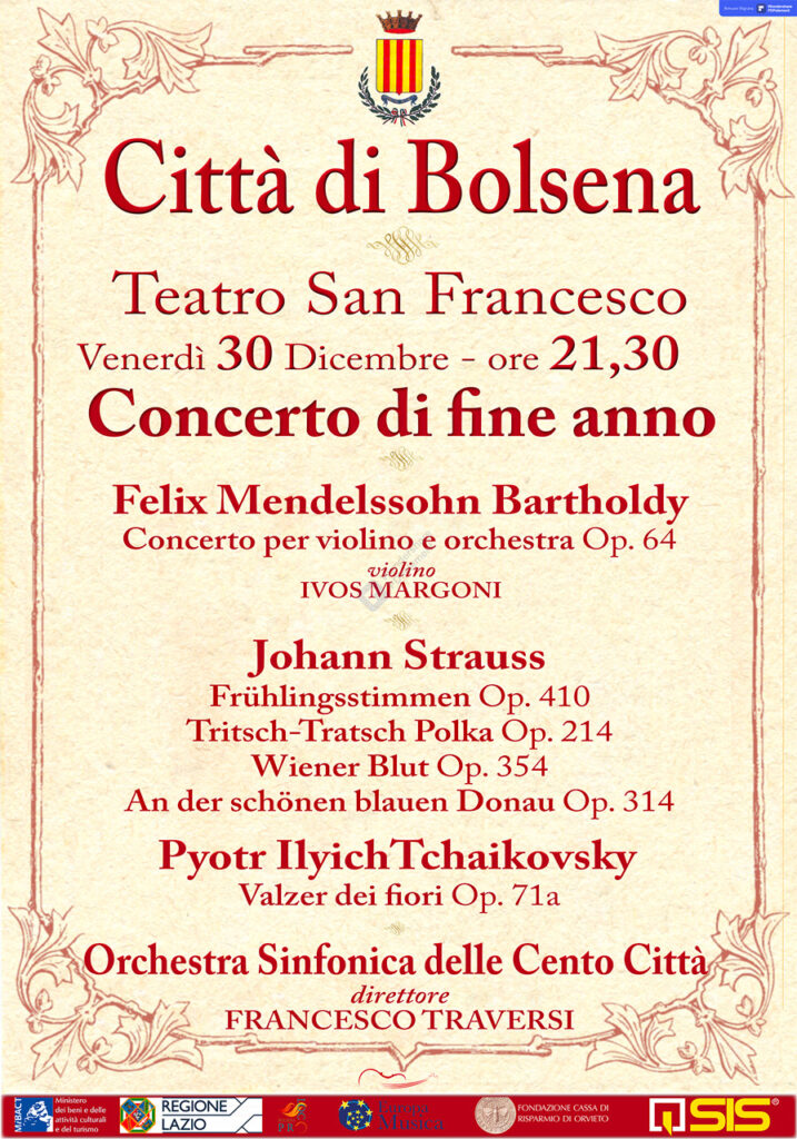 News ed Eventi Concerto di Fine anno 2022 Pubblicato il Dicembre 18, 2022Dicembre 18, 2022 da admin 18 Dic Teatro San Francesco a Bolsena. Venerdì 30 Dicembre alle ore 21,30.